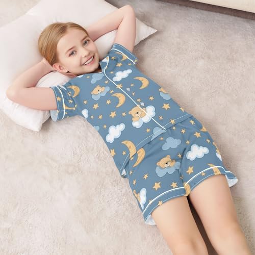 ALAZA Sleeping Bear Moon Star Pajamas Satin Pajama Set Short Sleeve Button Down Sleepwear 2