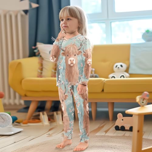 Pajama Sets Long Sleeve Highland Cow Cherry Blossom Soft Comfy Sleepwear 2 Piece PJS 3-8T 2