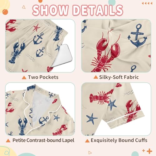 HOT ! Anchor Shrimp Pattern Summer Satin Pajama Set, Cute Button-Down Sleepwear Pj Set for Sleep Wears