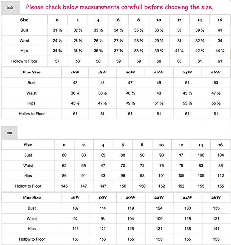 • How to Choose Size: Please refer to the Size Chart which follows dress images. If you want the dress to be customized, choose the size closest to your own size and send the measurements of bust, waist, hips, hollow to floor, height and heels. There is No Extra Charge for custom service.