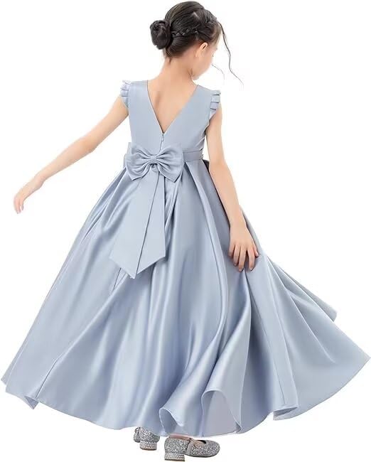 Satin Flower Girl Dress Flying Sleeve V-Back Pageant Dress Holiday Birthday Party Prom Ball Gown with Bow-Knot 6