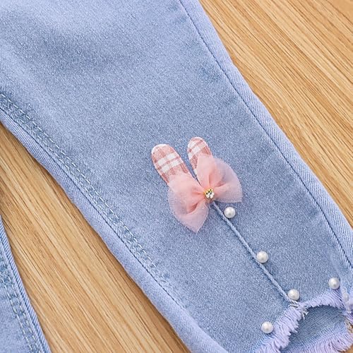 HOT ! Flared Jeans for Kids Girls Baggy Elastic Waist Bow Pearl 𝗥aw 𝗛em Denim Pants Casual Lightweight Trousers