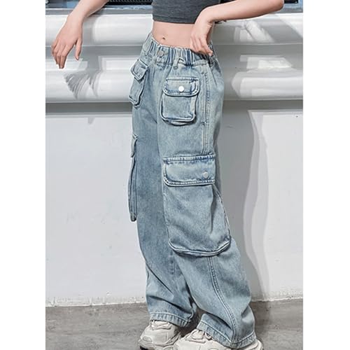 HOT ! Baggy Jeans for Girls Multi Flap Pockets Cargo Adjustable Waist Wide Leg Pants Streetwear Cute Jeans for Girls Denim Pants