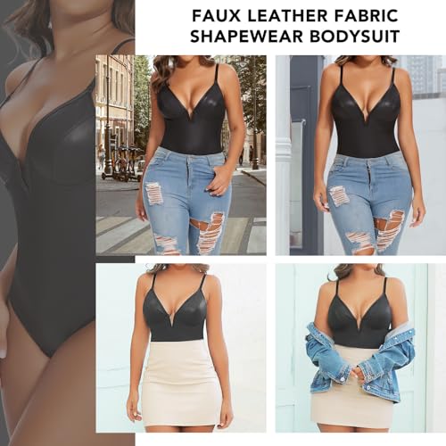 SHAPERIN Women's Deep V Neck Faux Leather Corset Bodysuit Tummy Control Shapewear Thong Body Shaper Plunge Cami Top 3