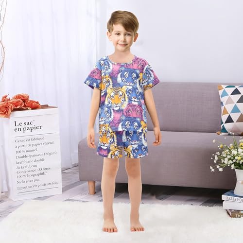 ALAZA Blue Colorful Tiger Animal Pajamas Set Short Sleeve Cotton Sleepwear Summer Pjs 2 Piece 5-14Y 6