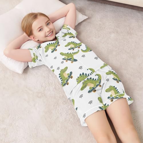 ALAZA Cartoon Crocodile Animal White Pajamas Satin Pajama Set Short Sleeve Button Down Sleepwear 2