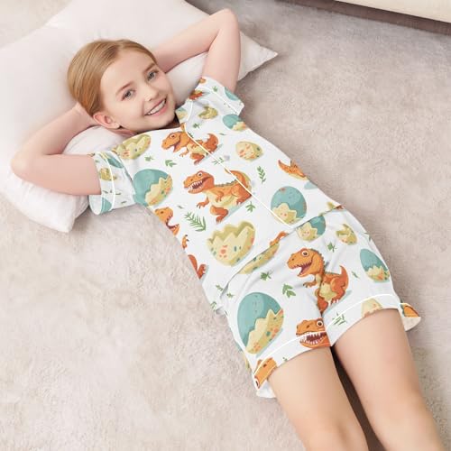 HOT ! ALAZA Dinosaur with Egg Leaves Pajamas Satin Pajama Set Short Sleeve Button Down Sleepwear
