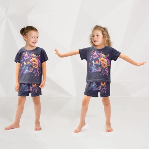 ALAZA Neon Color Skull and Flowers Pajama Set Short Sleeve Sleepwear Soft Lounge Nightwear 1