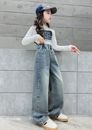 Kids Girls' Fashion Elastic Waist Wide Leg Baggy Denim Pants Straight Washed Loose Jeans Age 5-14 Years 6