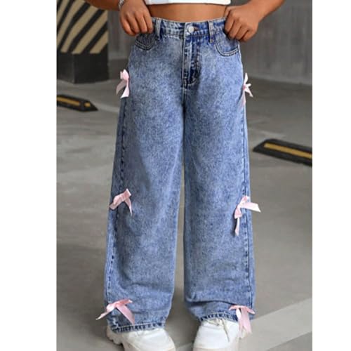 HOT ! Bow Jeans for Girls Wide Leg Baggy Denim Pants Cute High Waisted Trousers,Cute Outfits for Girls 10-12,Bow Pants