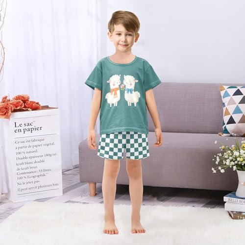 Checkerboard Plaid Llama Flower Teal Pajama Set Short Sleeve Pajamas Shorts Sets Cotton PJS 2 Piece Clothes Set 5Y 4