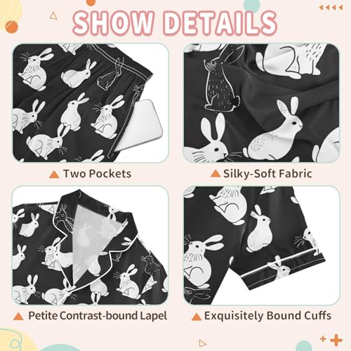 ALAZA White Rabbit Bunny Black Satin Pajamas Set Short Sleeve Button Down Sleepwear Summer Pjs 2 Piece 7