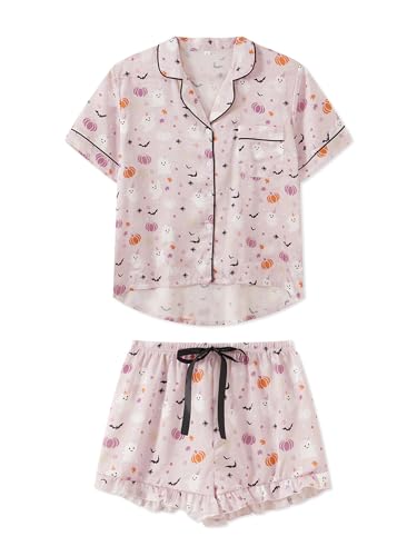 • DESIGN: Women short sleeve shirt matching loose fit shorts pj set, Halloween pajama set 2 piece, our pajama top features with short sleeve, notch collar, v neck, button front, lapel collar, button down top with short sleeve, our pajama bottom features elastic waistband, loose fit, high waist, comfy to wear all the day