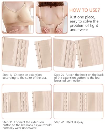 • [Easy to use]Just attach the hooks on the underside of the extender to your bra hook loops,then use the hooks on your bra to attach to the hook loops on the front side of the extender.It can comfortably increase the band range of your bra.