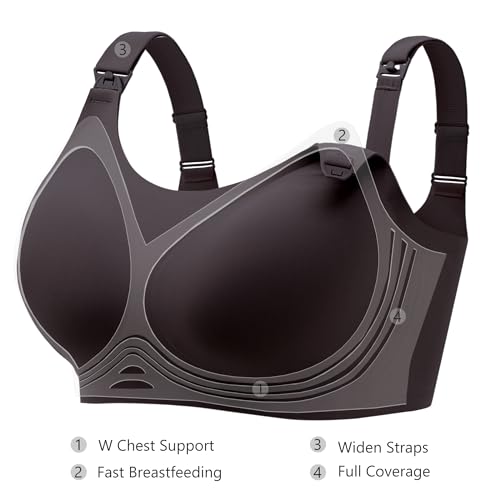 • Simplified Nursing Experience - Front pull-down cups allow you to take off the cups with just one hand and feed your baby anytime, anywhere! Wider straps minimize the discomfort and pressure when women with large breasts are exercising. Wireless cups and seamless weave make a better breastfeeding feeling.
