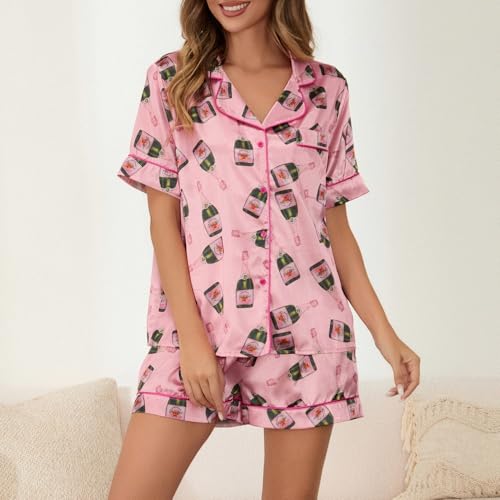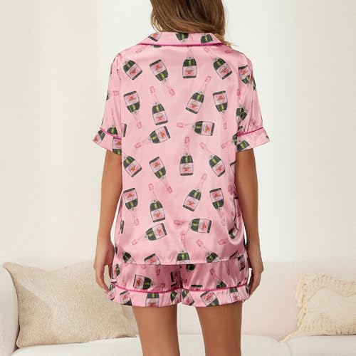Juakoso Women Champagne Bottle Pajamas Sets Wine Can Print Pjs Sets Silk Satin 2 Piece Sets Short Sleeve Shirts Shorts Sets 2