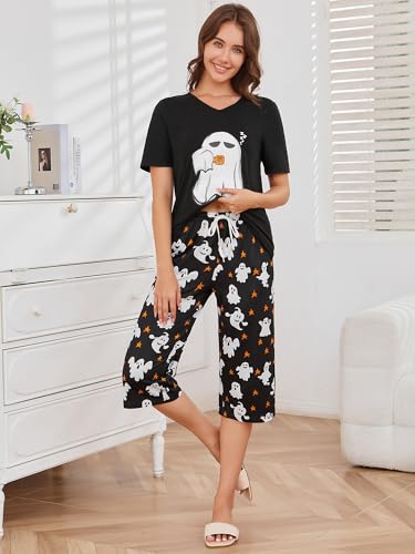 • Features:This two pieces halloween pjs feature cute graphic halloween element print,loose fit design,v neck short sleeve tops and capri pants with drawstring waist and pockets