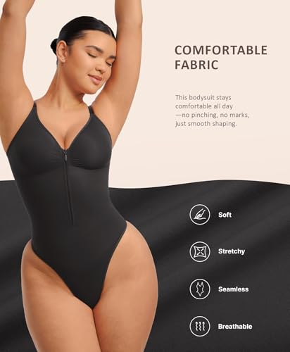 FeelinGirl Shapewear Bodysuits Tummy Control for Women: Seamless Zip-Up Thong Snatched Waist Body Suit V Neck Body Shaper Black X-Large 1