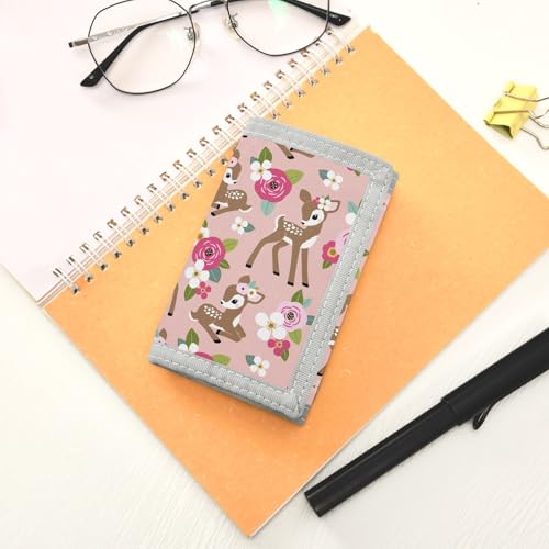 Floral Cute Fawn Kids Wallet for Boys Girls, Teen Canvas Trifold Purse with Zipper Coin Pocket 1