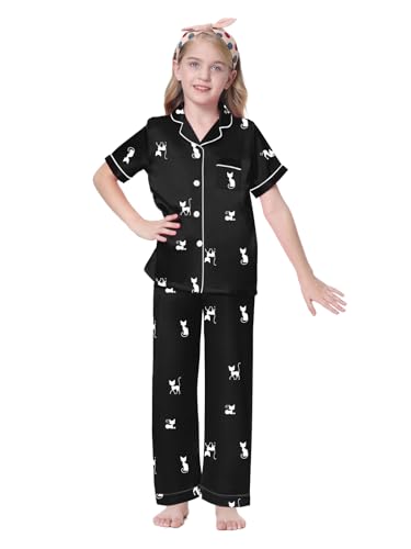 HOT ! Schbbbta Girls 3 Pieces Pajamas Sets Silk Satin Sleepwear Button Down Short Sleeve Pjs Outfits
