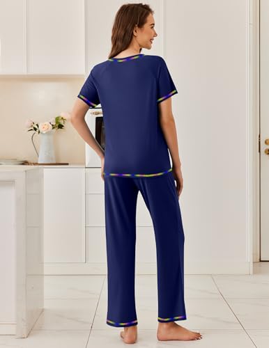 • Cute Pj Sets : Ekouaer 2 piece womens pjs sets include a round neck short sleeve top and a pair of long pants with elastic waistband. These short sleeve pajama sets for women feature stylish piping lines and have side pockets on pants for convenient storage