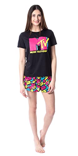 • CLASSIC CHARACTER DESIGN - This pajama set-top features the MTV logo in neon yellow, pink, and blue with the phrase "Music Television" below it. The bottoms feature cassette tapes in those same colors and an all-over print of the same MTV logo.