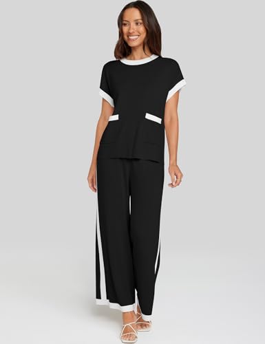HOT ! UEU Women 2 Piece Outfits Lounge Set Summer Short Sleeve Sweater Knit Tops Wide Leg Pants Matching Loungewear Set