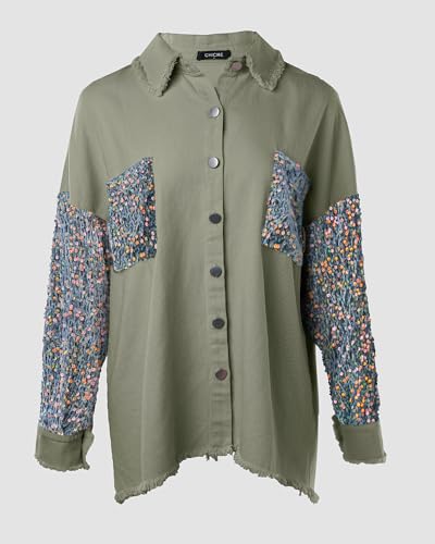 CHICME Womens Denim Jacket 2025 Sequin Patchwork Long Sleeve Jackets Top Button Front Oversized Denim Shacket 2