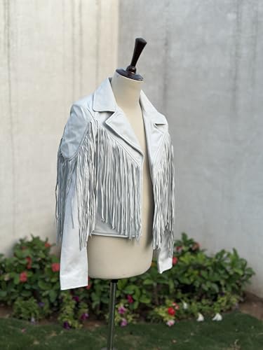 Treegalore Womens Genuine White Lambskin Leather Western Cowgirl Fringe Jacket With Fringe Native American Style 5