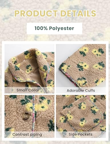 • Features: Long sleeves, lapel collar, front button closure, floral printed pattern, contrast piping trim, fleece fabric, two front patch pockets. Sherpa fleece jacket, fuzzy teddy jacket