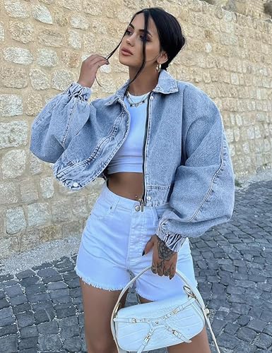 Qazel Vorrlon Womens Oversized Cropped Denim Jacket Zip Up Light Wash Blue Bomber Shacket Jean Jacket for Women Trendy 2025 6
