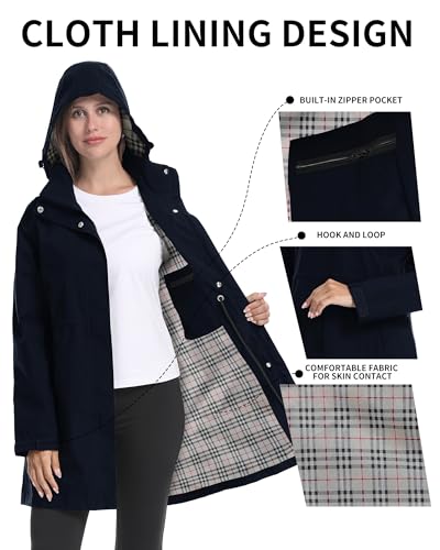 iCreek Women's Rain Jacket Long Raincoat Hooded Waterproof Windproof Plaid Lined Trench Coat Lightweight Packable for Outdoor 5