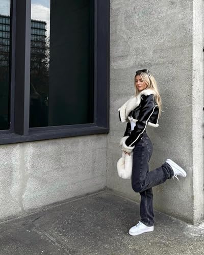 utcoco Womens Leather Jacket Faux Fur Moto Jacket Winter Trench Coat Cropped Shearling Jacket 5