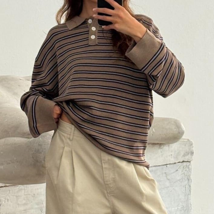 • Size: Women y2k striped pullover top, long sleeve lapel collar rugby polo shirt, fit from S to XL. Please check the size table before you ordering
