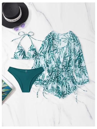 COZYEASE Women's 2025 Summer 3 Piece Swimsuits Tropical Print Bikini Set Halter Drawstring Bathing Suits with Cover Up 2