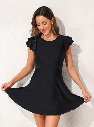 • [One Piece Swimdress] One piece swimsuit dress with built-in briefs, ruffled sleeves, soft removable padded cups and a U-back design shows a fashionable and modest appearance.