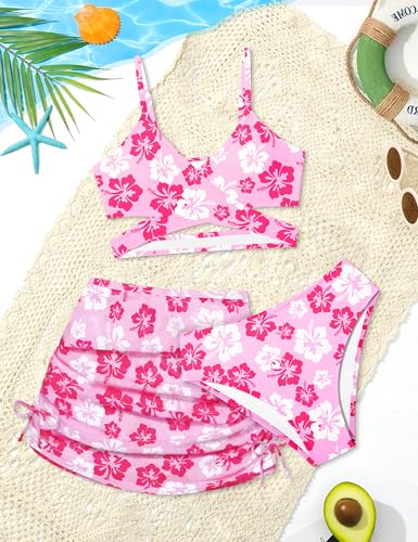 More information about Girls Swimsuits 3 Piece Bathing Suit Allover Printed Criss Cross Bikini Set with Cover Up Skirt Beach Swimwear 7-16 Years