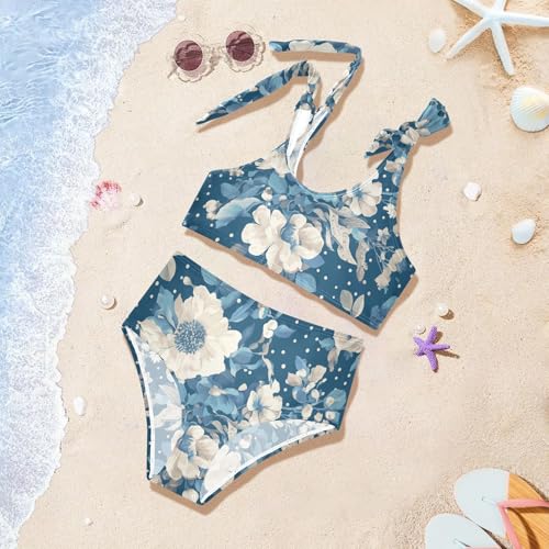 Vintage Blue Dots Floral Pattern Girls Two Piece Kids Bikini Set Scoop Neck Bathing Suit Swimwear Adjustable Strap 2