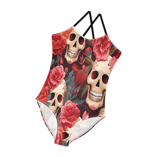 Girl Bathing Suits Beach Apparel 3-10 Y with Adjustable Shoulder Strap, Funny Skulls Red Flowers 1