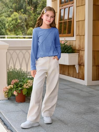 Haloumoning Girls Long Sleeve Shirts Pleated Casual Crewneck Fall Fashion Tops Basic Tees 5-14Y 6