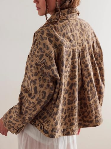 Women's Leopard Print Denim Jacket Casual Long Sleeve Button Down Loose Cheetah Vintage Jean Coat with Pockets 1