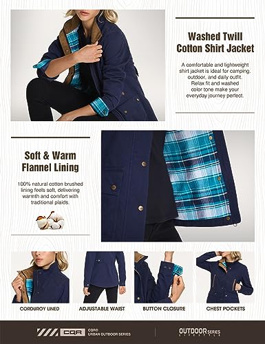 HOT ! CQR Women's Twill All Cotton Flannel Shirt Jacket, Soft Long Sleeve Shirts, Corduroy Lined Outdoor Shirt Jackets