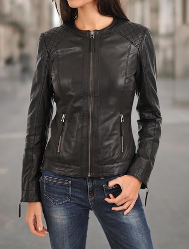 Azrah 100% Leather Jacket for Women - Collarless Deep Neck & Slim Fit - Moto, Bomber, Biker Winter Casual Wear 1