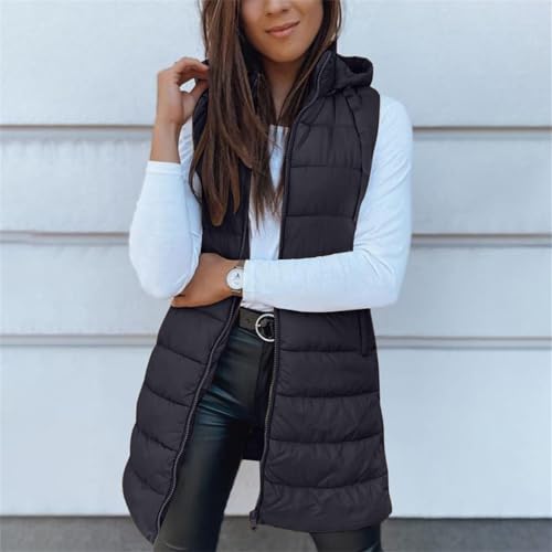HOT ! Long Puffer Vest Women, Solid Color Sleeveless Hood Fall Coats Trendy 2025, Zip Up Puffy Jackets Winter Outwear, Black, womens long vest, S
