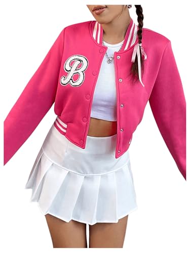 HOT ! SHENHE Women's Graphic Baseball Jacket Letter Bomber Button Down Striped Trim Crop Varsity Jacket