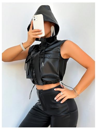 Verdusa Women's PU Leather Zip Up Cropped Vest Sleeveless Hooded Jacket with Pockets 1