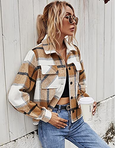 HOT ! Women's Casual Flannel Wool Blend Plaid Shacket Long Sleeve Single Breasted Button Short Jackets Coat