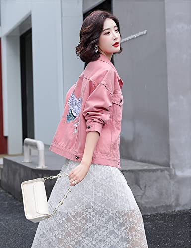 happlan Embroidered Denim Jacket for Women Loose Lapel Button Down Print Shirt Coat Shacket 7