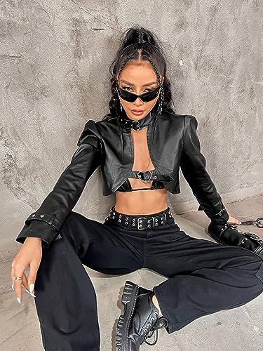 More information about WDIRARA Women's Leather Buckle Belted Neck Long Sleeve Jacket Short Outwear Tops