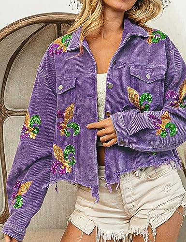 • ⚜️Retro Chic: Embrace a vintage vibe with our women's corduroy shirt shacket jacket, featuring a distressed gold lily sequin design and raw hem for an edgy look